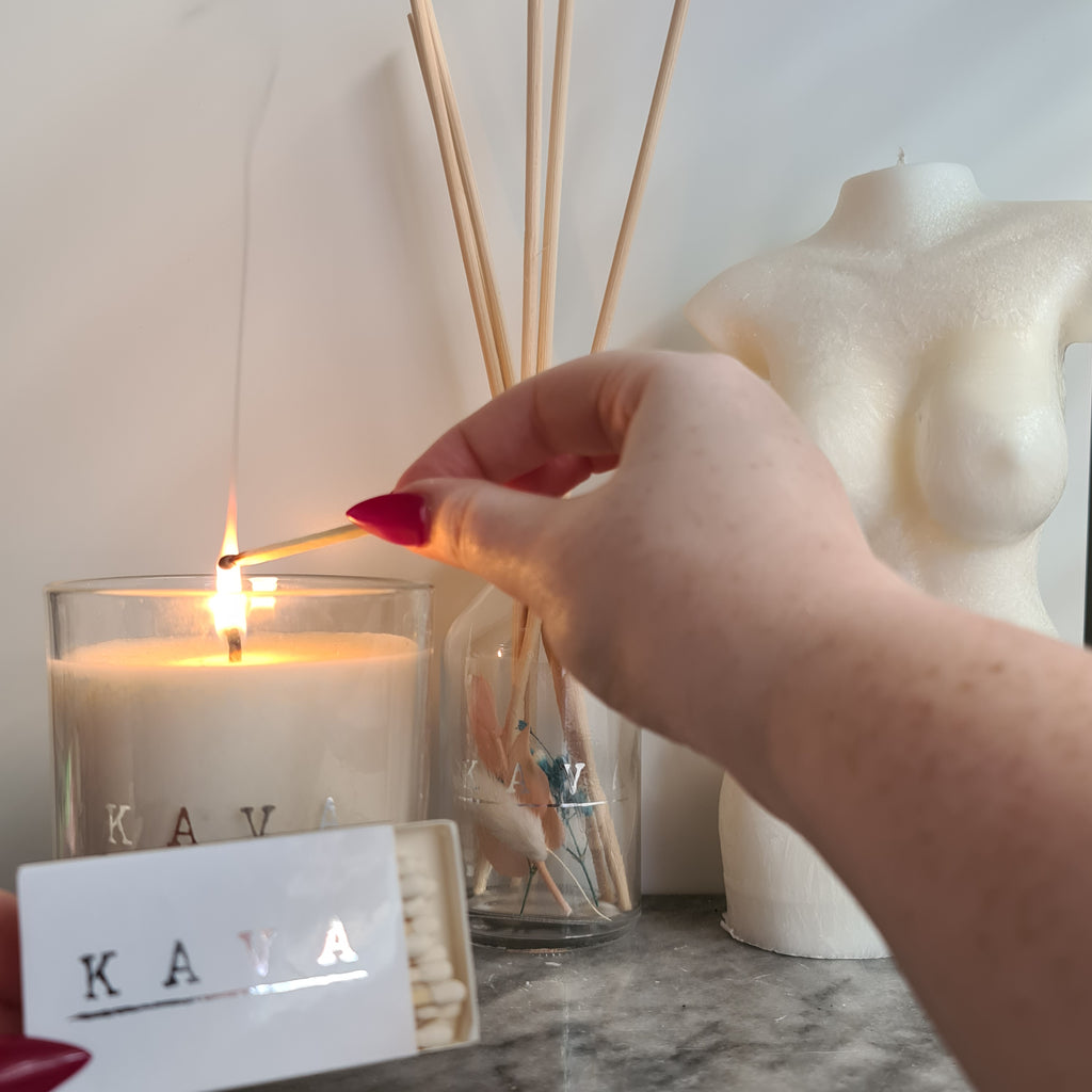 A white box of matches with Silver Foil KAVA logo. 20+ white tipped matches inside. Taking candle lighting to a whole new boujee level š